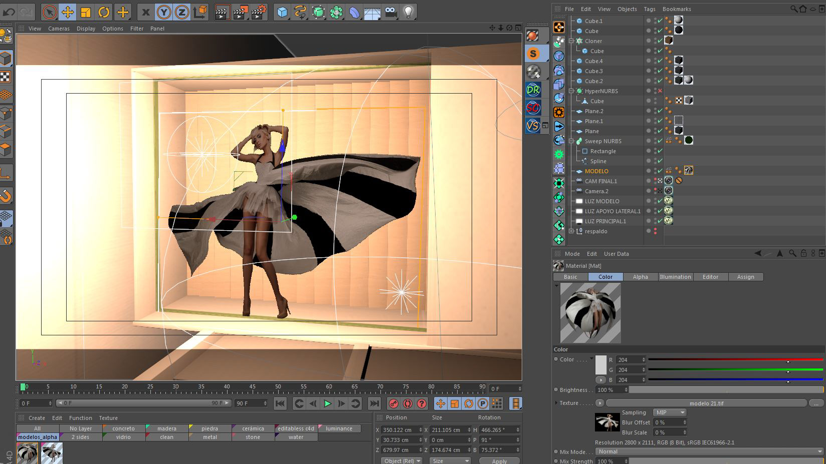 El reto de este proyecto estuvo cuidar al máximo el detalle desde el recorte de las modelos (sobretodo el cabello y transparencias de la ropa) de su fondo original y la integración de la imagen 2D sobre un escenario 3D. En este caso se hizo necesario importar la modelo sobre el escenario para obtener una buena distribución de las luces y brillos sobre la modelo así como las reflexiones sobre el entorno y posteriormente trabajar arduamente la composición en photoshop, acentuando por supuesto la línea y la modelo.